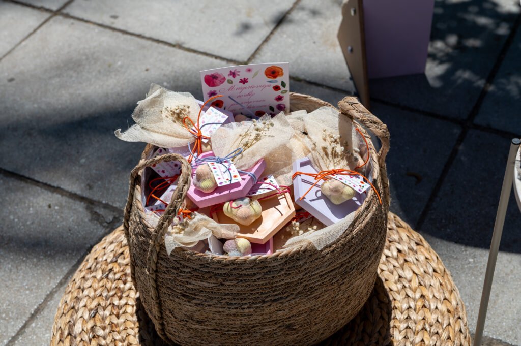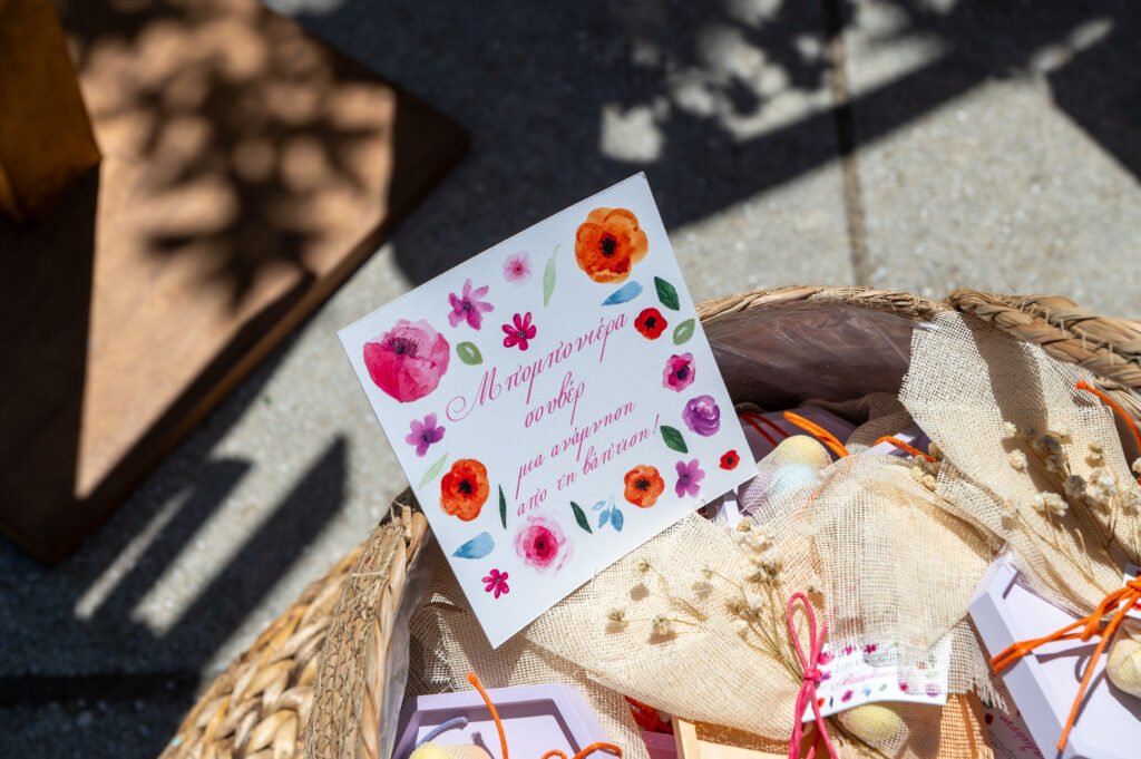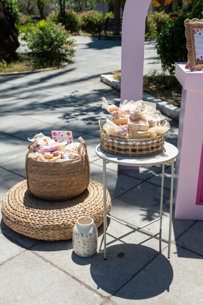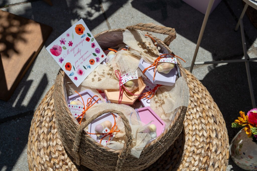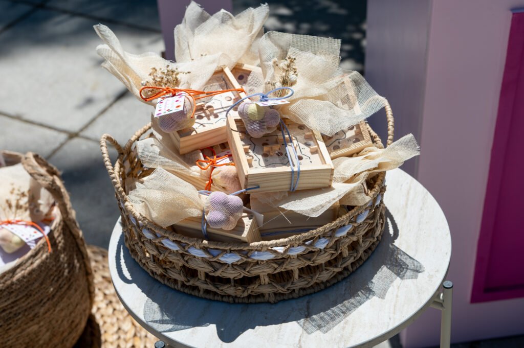 Χειροποίητα σουβέρ από σκόνη πορσελάνης, σε λιλά, φούξια και πορτοκαλί αποχρώσεις, φτιαγμένες μία-μία στο χέρι. Για τους μικρούς καλεσμένους, επιλέχθηκε ένα ξύλινο παιχνίδι “φιδάκι” — μια γλυκιά, νοσταλγική πινελιά που έφερε χαμόγελα.