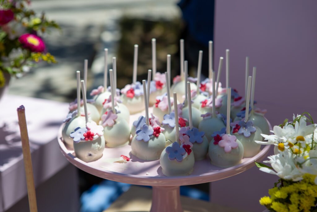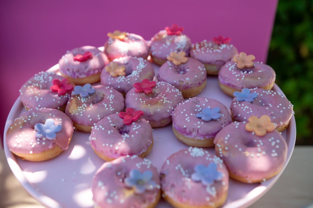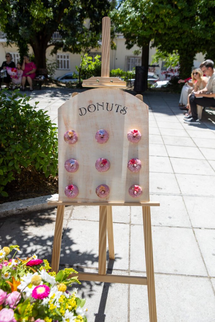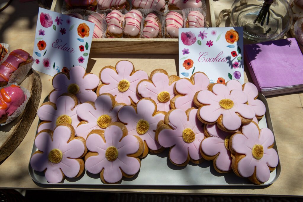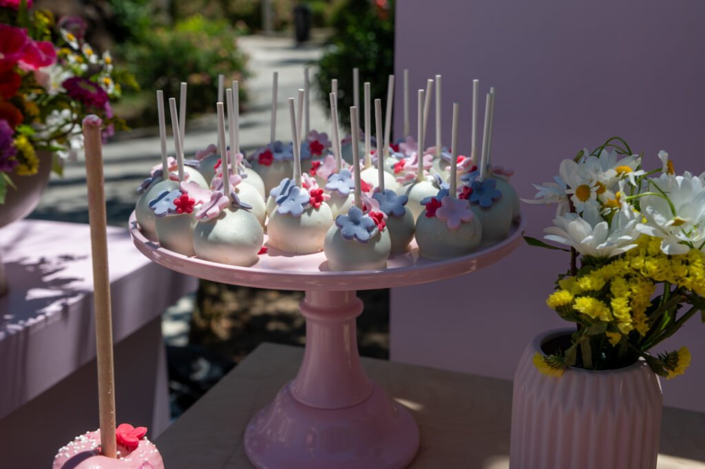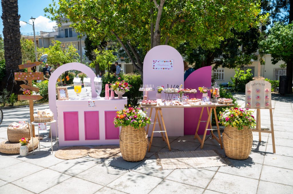 Cake pops, cupcakes, donuts, macarons και μπισκότα διακοσμημένα με λουλουδάτες λεπτομέρειες ακολούθησαν πιστά τη χρωματική παλέτα. Δροσερή λεμονάδα, πορτοκαλάδα και νερό σε γυάλινες βρύσες συμπλήρωσαν την εικόνα, δίνοντας μια αίσθηση φροντίδας και φιλοξενίας.