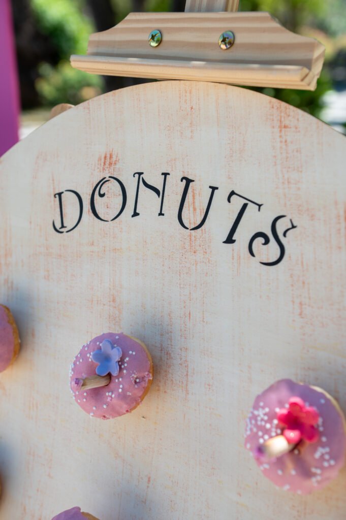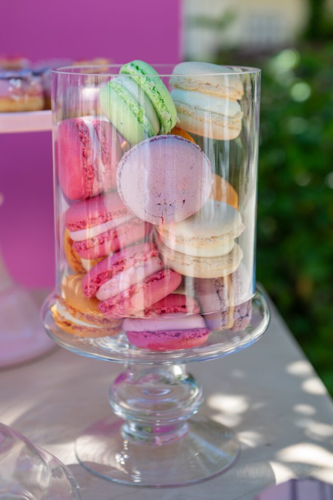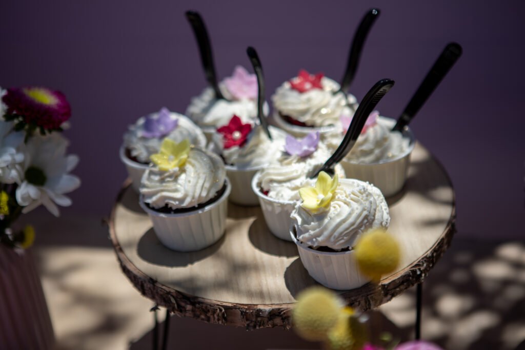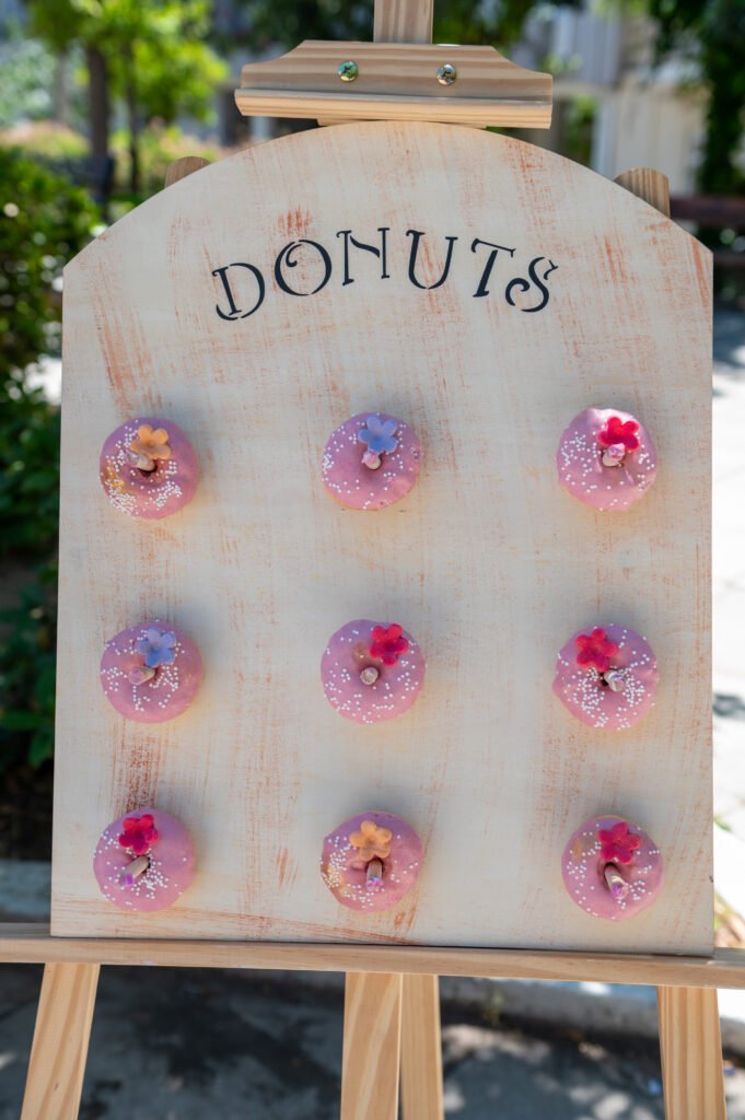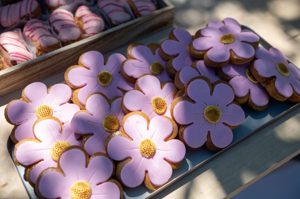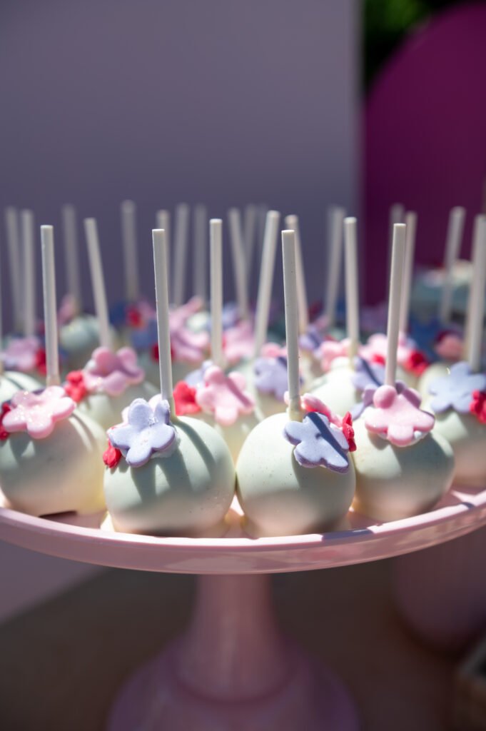 Cake pops, cupcakes, donuts, macarons και μπισκότα διακοσμημένα με λουλουδάτες λεπτομέρειες ακολούθησαν πιστά τη χρωματική παλέτα. Δροσερή λεμονάδα, πορτοκαλάδα και νερό σε γυάλινες βρύσες συμπλήρωσαν την εικόνα, δίνοντας μια αίσθηση φροντίδας και φιλοξενίας.