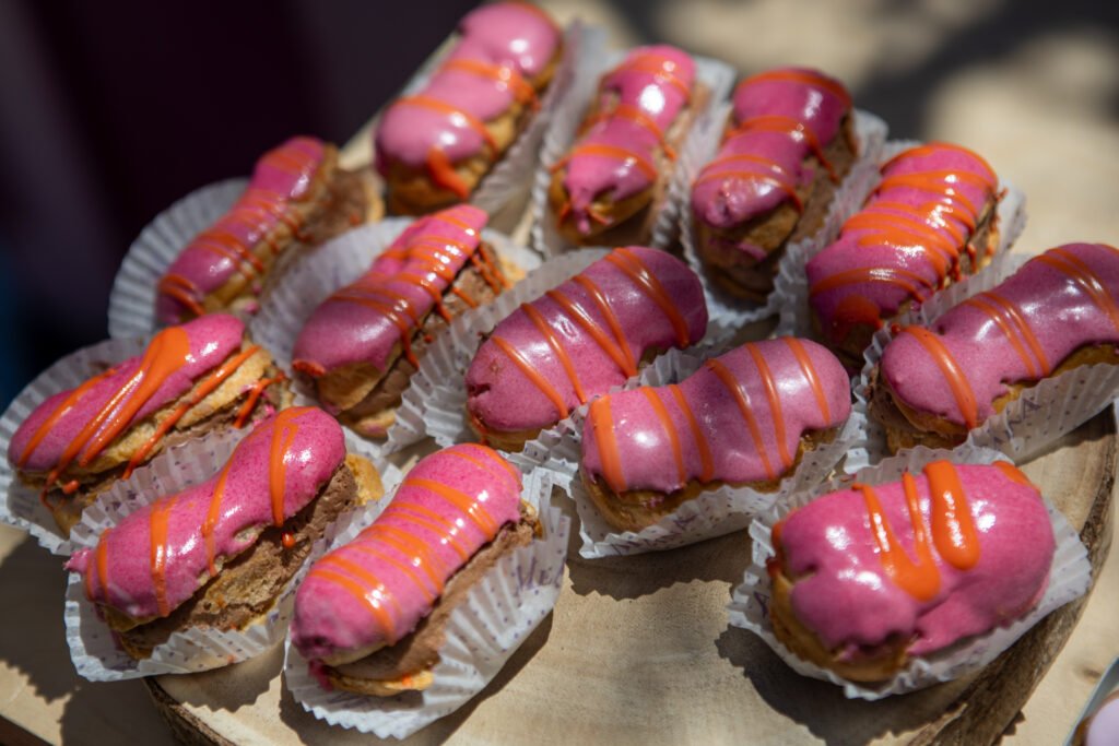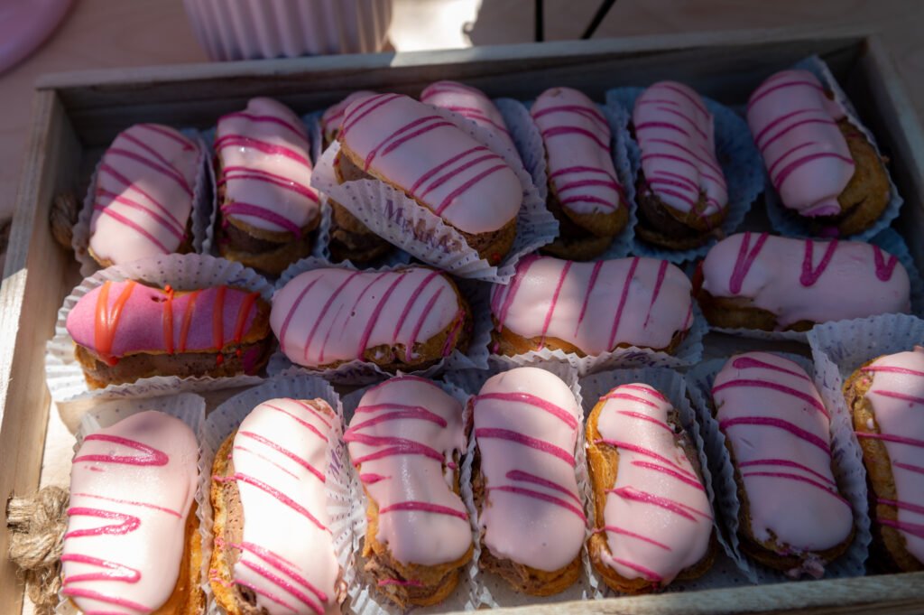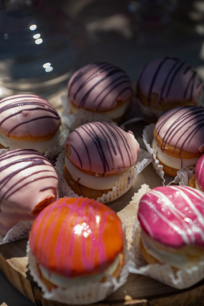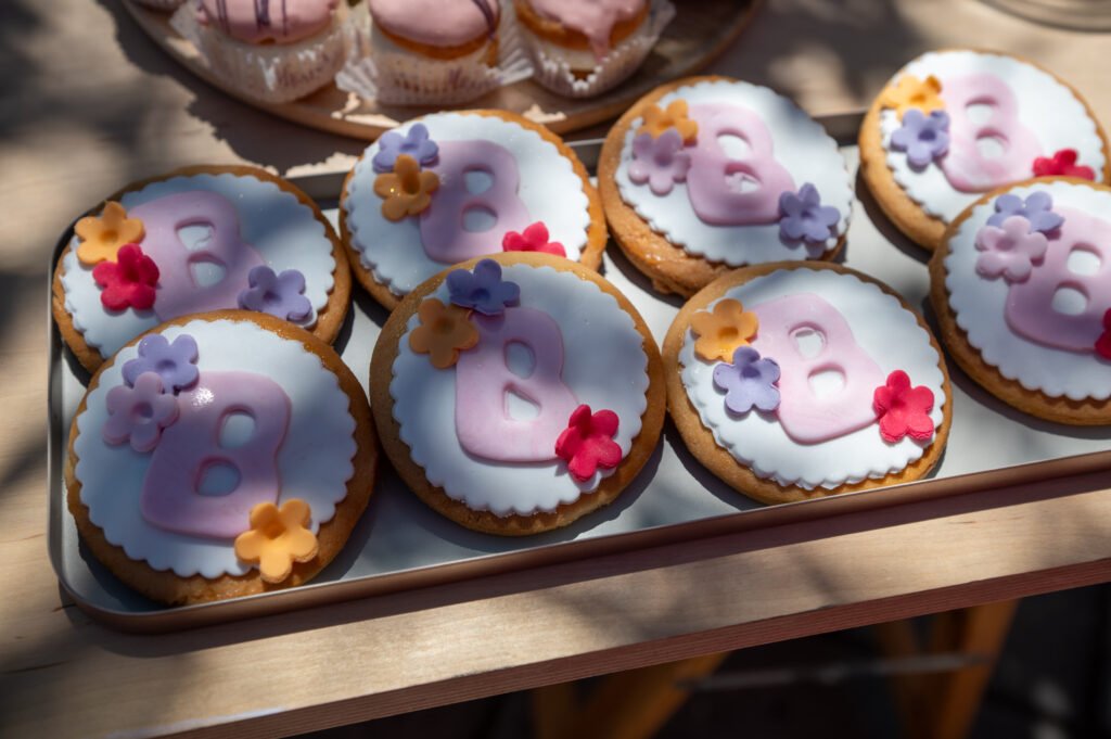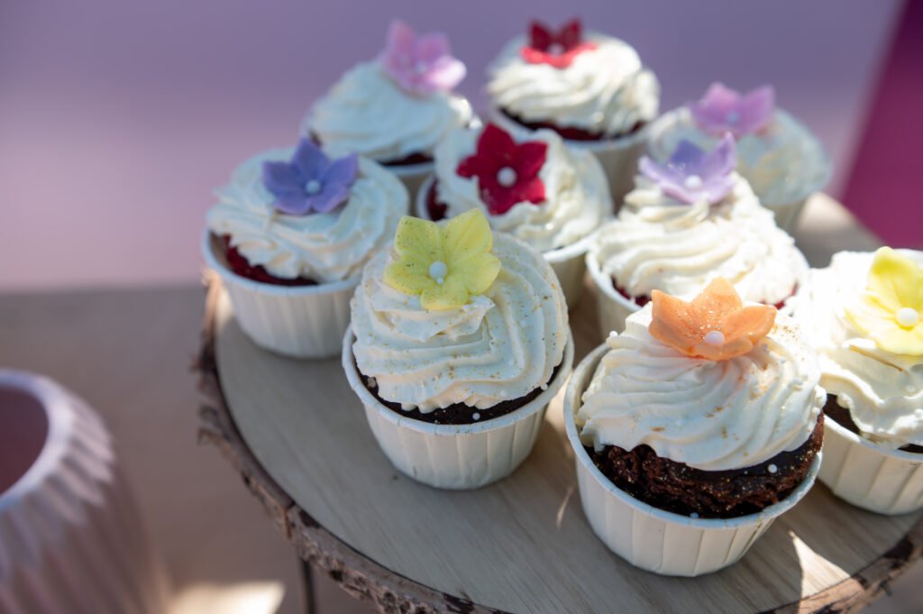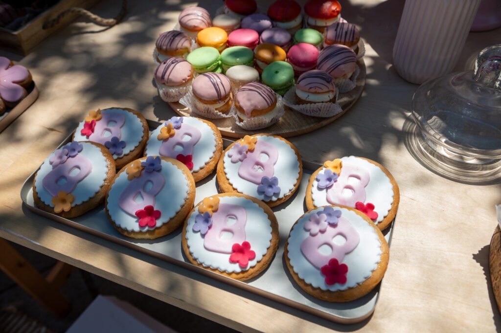 Cake pops, cupcakes, donuts, macarons και μπισκότα διακοσμημένα με λουλουδάτες λεπτομέρειες ακολούθησαν πιστά τη χρωματική παλέτα. Δροσερή λεμονάδα, πορτοκαλάδα και νερό σε γυάλινες βρύσες συμπλήρωσαν την εικόνα, δίνοντας μια αίσθηση φροντίδας και φιλοξενίας.