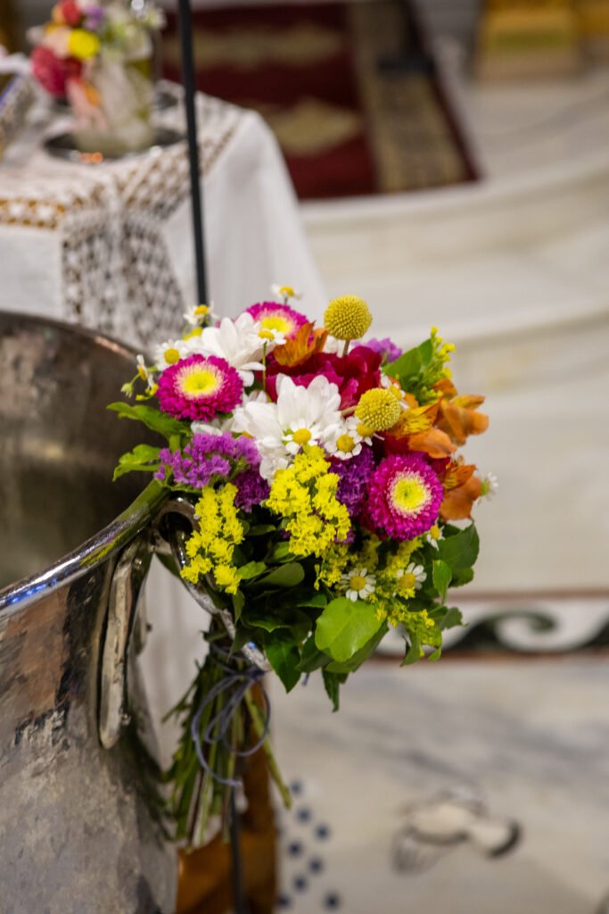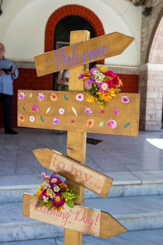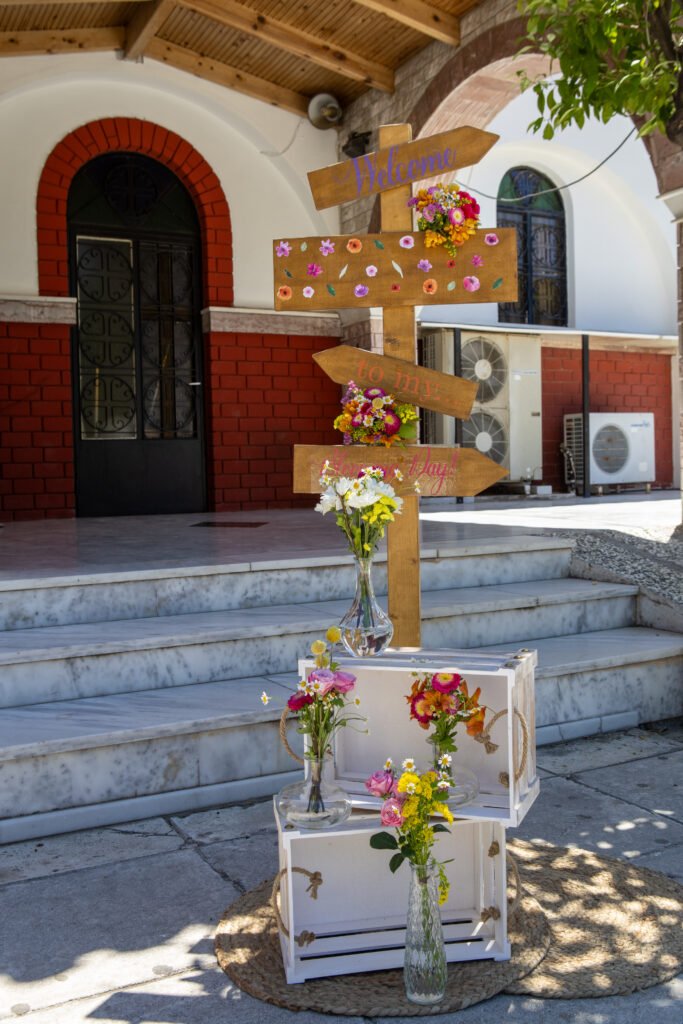 Στην είσοδο της εκκλησίας, ξύλινες πινακίδες με λουλούδια καλωσόριζαν τους καλεσμένους, ενώ μεγάλα ψάθινα καλάθια γεμάτα άνθη έντυναν τον χώρο με φυσική ζεστασιά. Το κεντρικό ξύλινο τραπέζι στήθηκε μπροστά από ένα έντονο floral backdrop σε φούξια και ροζ τόνους, δίνοντας βάθος και χαρακτήρα στο σκηνικό.