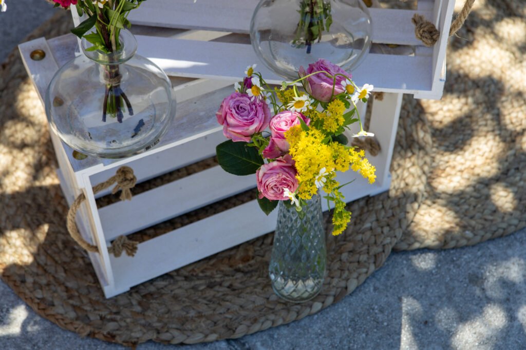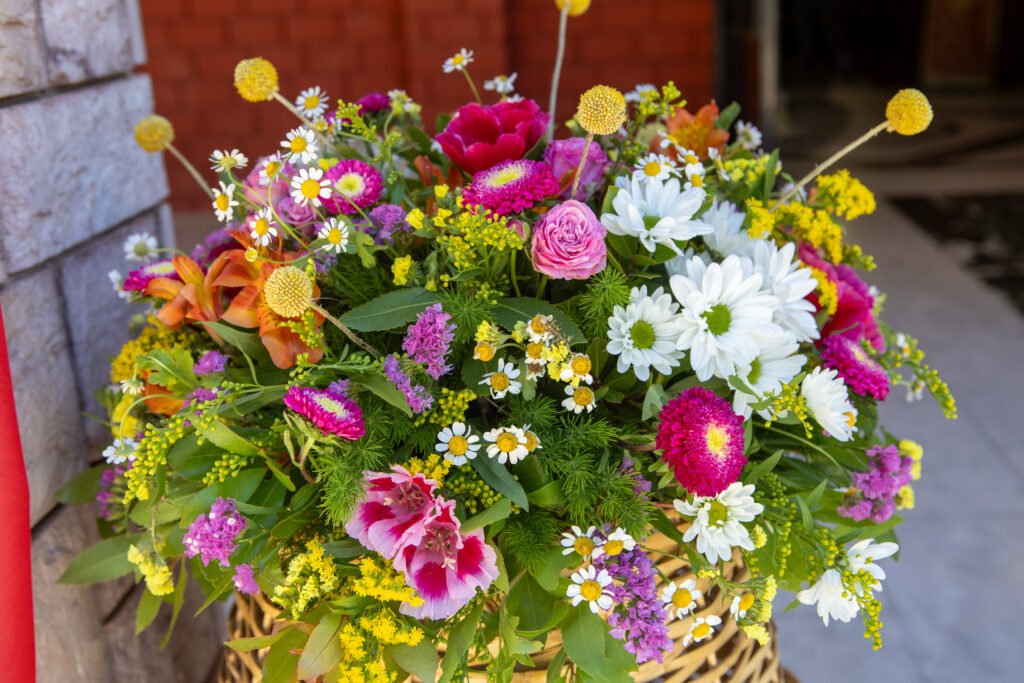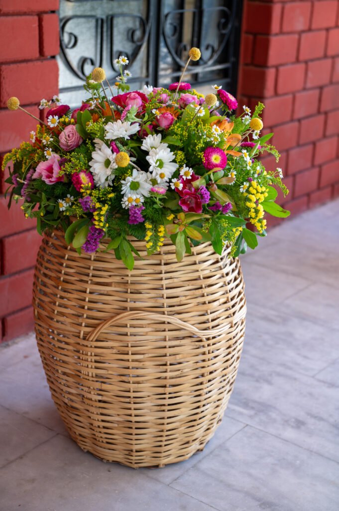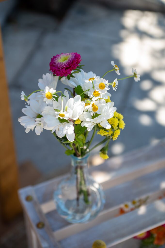 Τριαντάφυλλα, χαμομήλι, ζέρμπερες και διακριτικά άγρια άνθη συνδυάστηκαν σε συνθέσεις που έμοιαζαν αυθόρμητες — σαν να τις είχε δημιουργήσει η ίδια η άνοιξη.