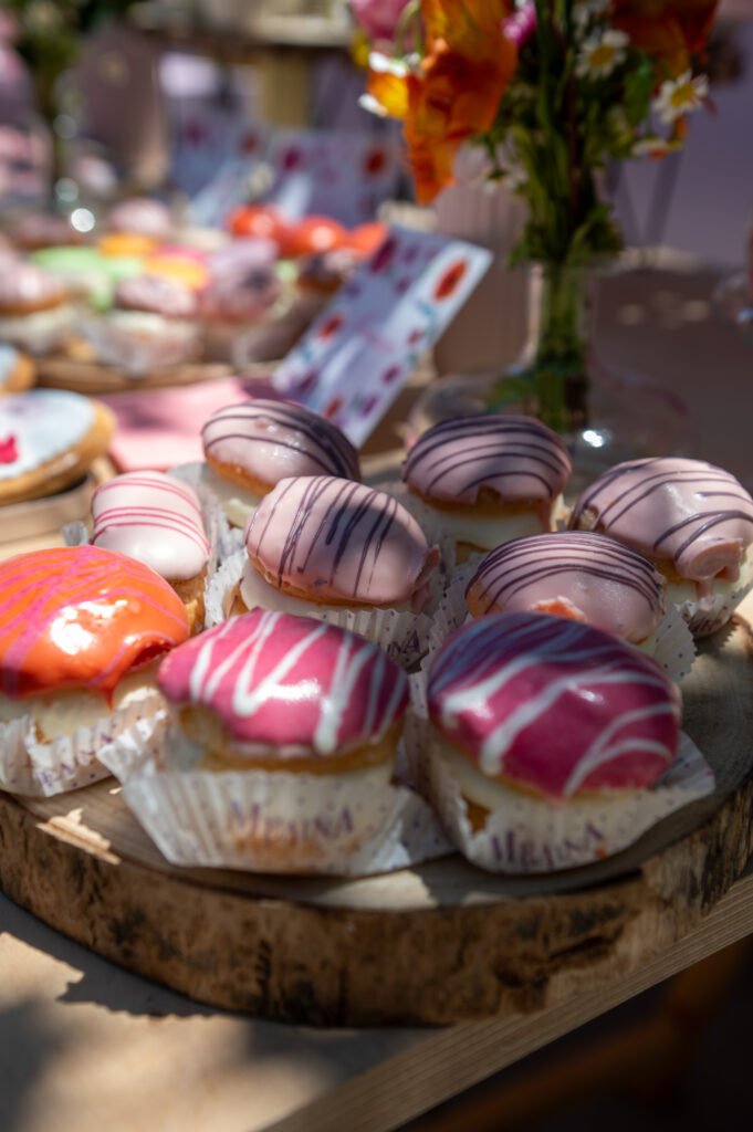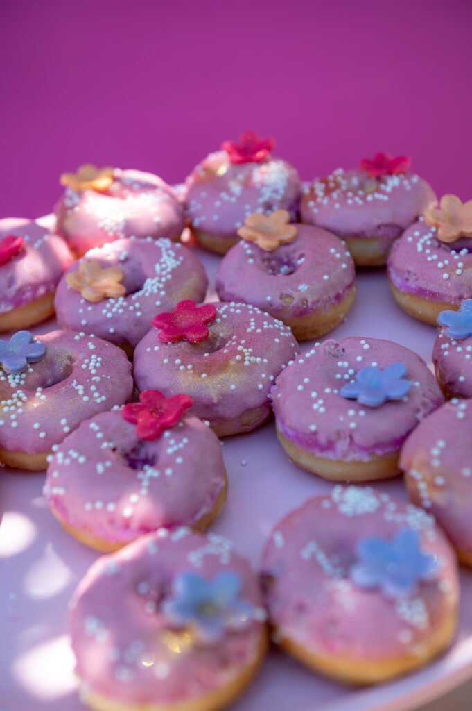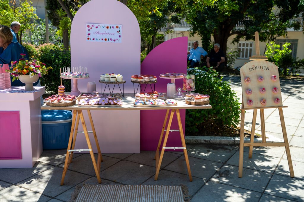 Cake pops, cupcakes, donuts, macarons και μπισκότα διακοσμημένα με λουλουδάτες λεπτομέρειες ακολούθησαν πιστά τη χρωματική παλέτα. Δροσερή λεμονάδα, πορτοκαλάδα και νερό σε γυάλινες βρύσες συμπλήρωσαν την εικόνα, δίνοντας μια αίσθηση φροντίδας και φιλοξενίας.