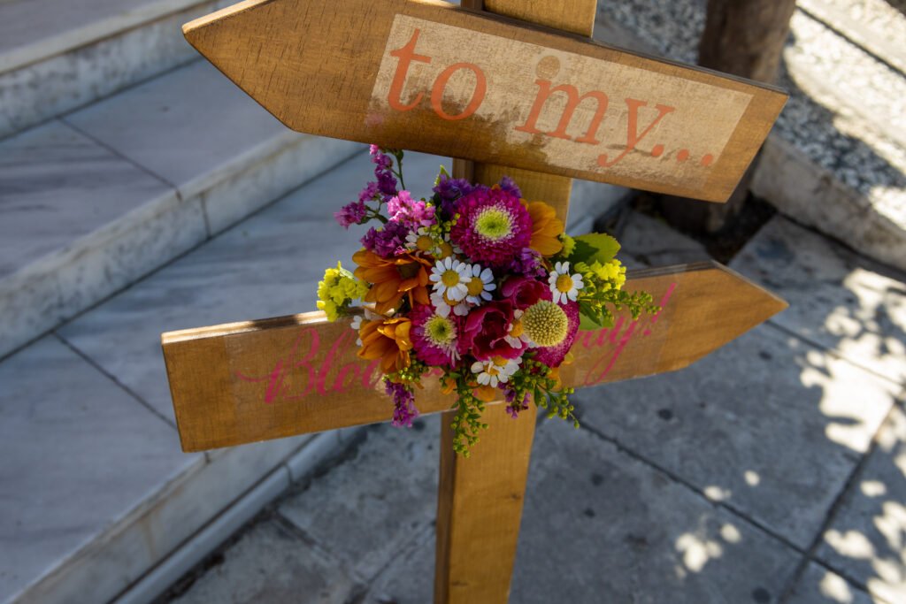 Στην είσοδο της εκκλησίας, ξύλινες πινακίδες με λουλούδια καλωσόριζαν τους καλεσμένους, ενώ μεγάλα ψάθινα καλάθια γεμάτα άνθη έντυναν τον χώρο με φυσική ζεστασιά. Το κεντρικό ξύλινο τραπέζι στήθηκε μπροστά από ένα έντονο floral backdrop σε φούξια και ροζ τόνους, δίνοντας βάθος και χαρακτήρα στο σκηνικό.
