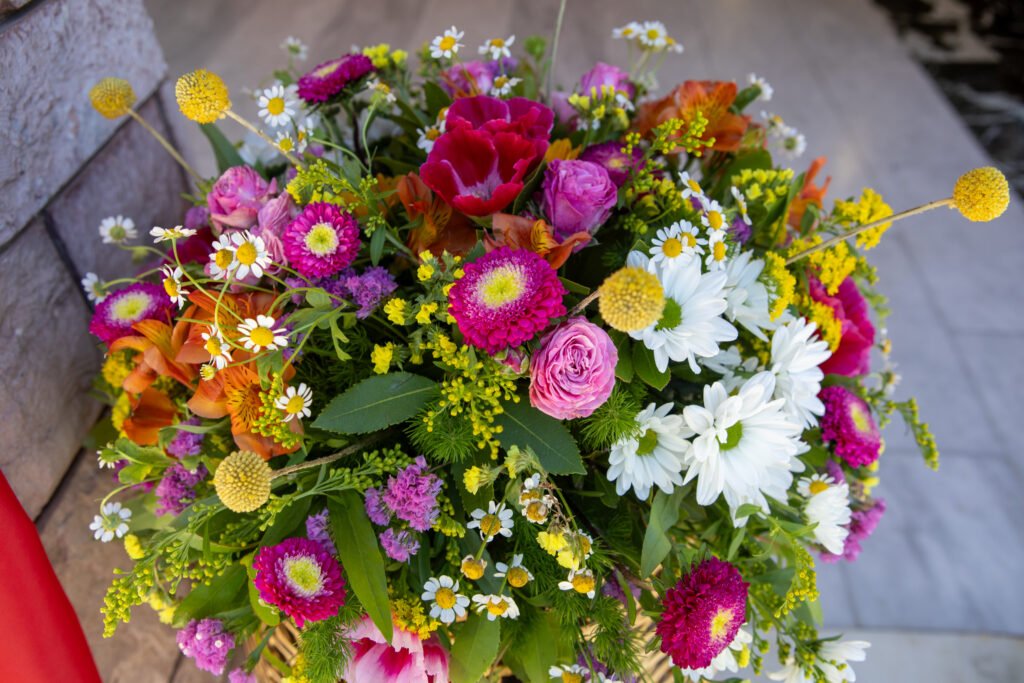 Τριαντάφυλλα, χαμομήλι, ζέρμπερες και διακριτικά άγρια άνθη συνδυάστηκαν σε συνθέσεις που έμοιαζαν αυθόρμητες — σαν να τις είχε δημιουργήσει η ίδια η άνοιξη.