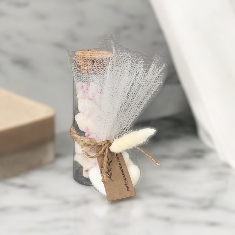 Μια μπομπονιέρα που συνδυάζει κομψότητα και αρωματική απόλαυση! Ο γυάλινος σωλήνας, γεμάτος με αρωματικά wax melts, είναι ένα ξεχωριστό δώρο που θα χαρίσει στους καλεσμένους σας ζεστές και όμορφες στιγμές. Μια ιδιαίτερη πινελιά που θα τους θυμίζει τη μαγεία της ημέρας σας!