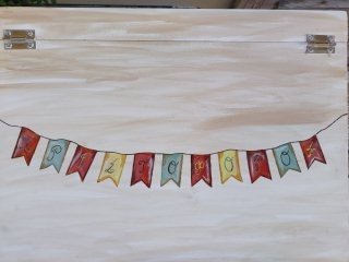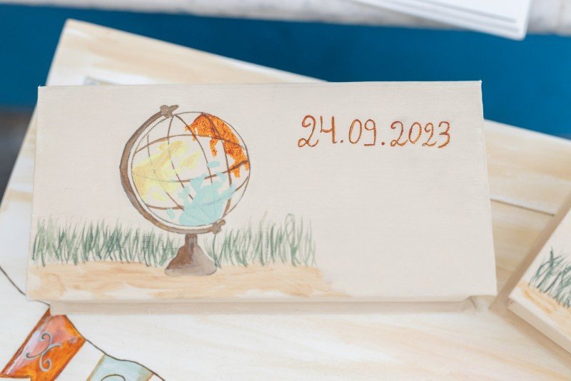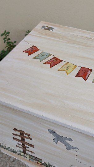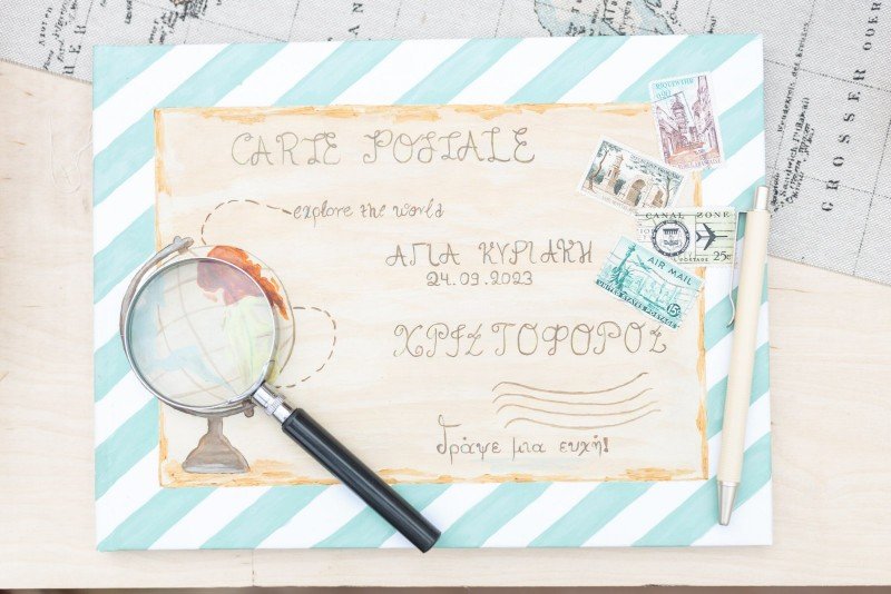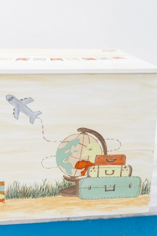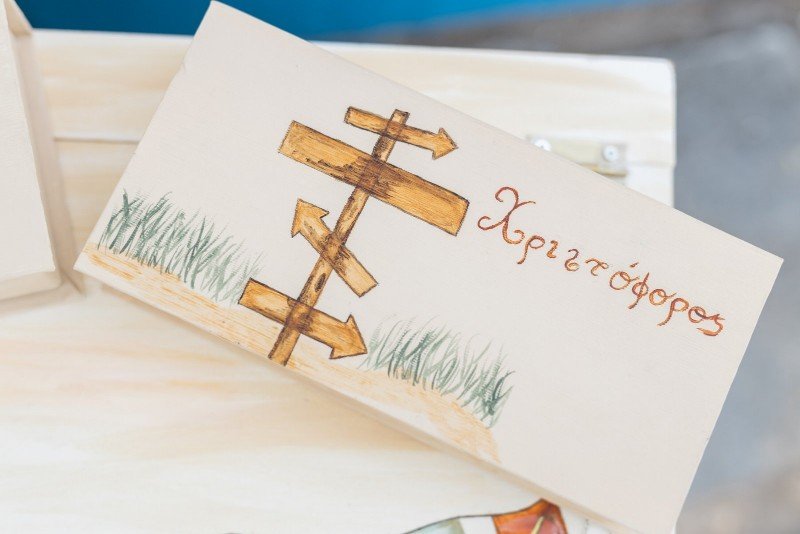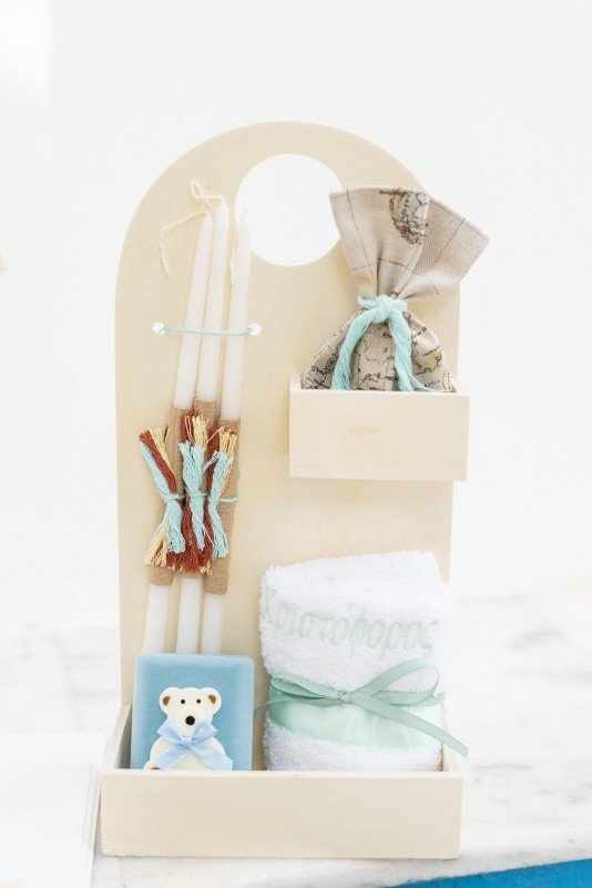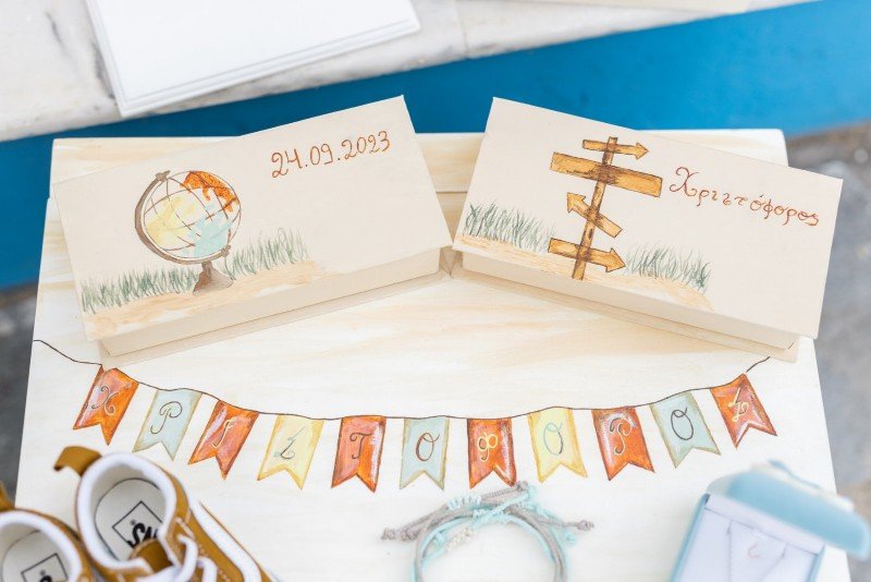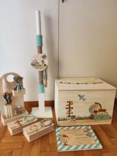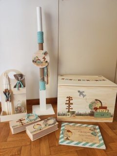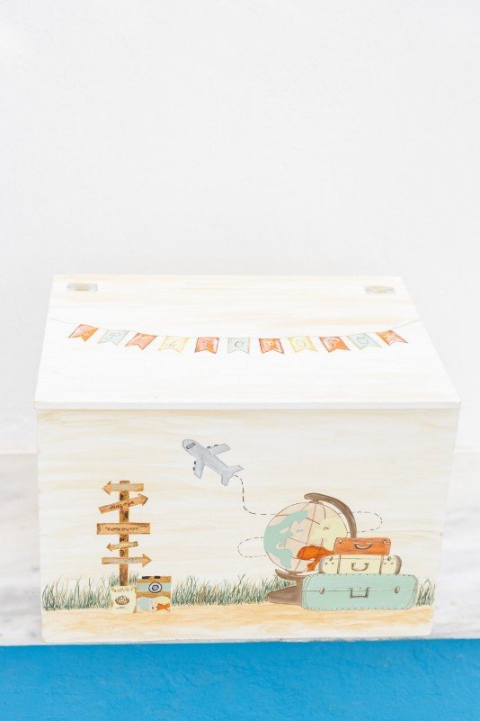 Βαπτιστικό πακέτο (σετ νονού) , ζωγραφισμένο στο χέρι με θέμα τα ταξίδια.