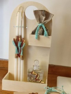 Το λαδοσετ(μπουκαλάκι λαδιού στολισμένο, 3 κεράκια στολισμένα, σαπουνάκι σε πουγκάκι , stand για λαδοσετ)