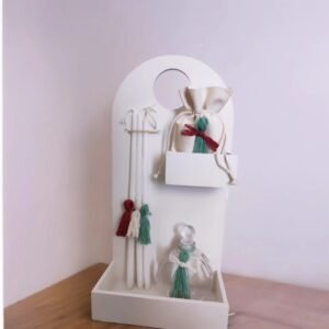 Το λαδοσετ(μπουκαλάκι λαδιού στολισμένο, 3 κεράκια στολισμένα, σαπουνάκι σε πουγκάκι , stand για λαδοσετ)