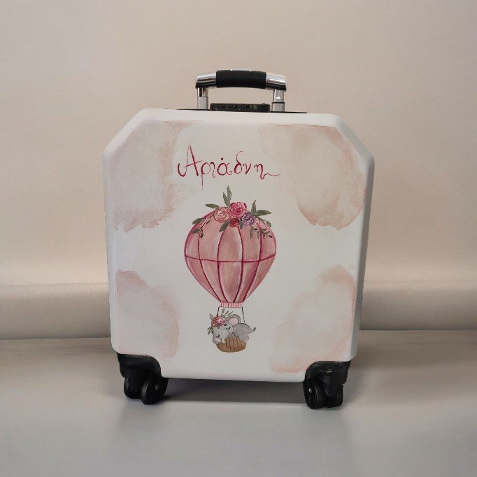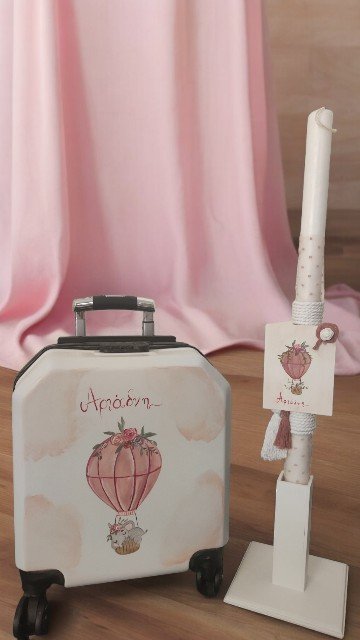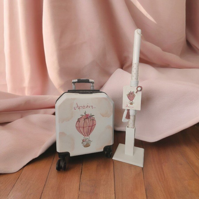 Βαπτιστικό πακέτο (σετ νονού) ζωγραφισμένο στο χέρι, σε βαλίτσα με θέμα το αερόστατο