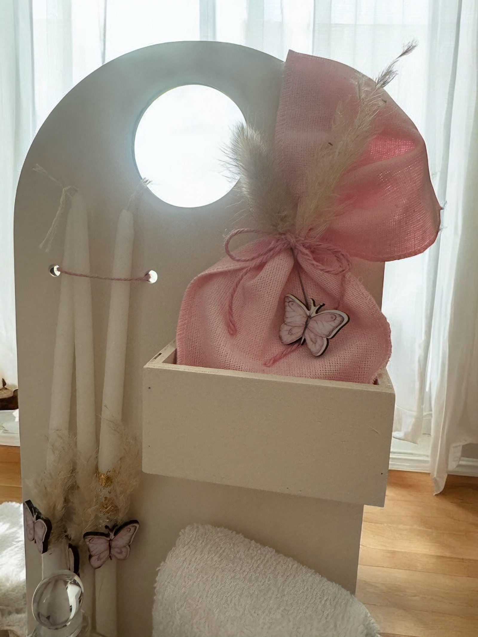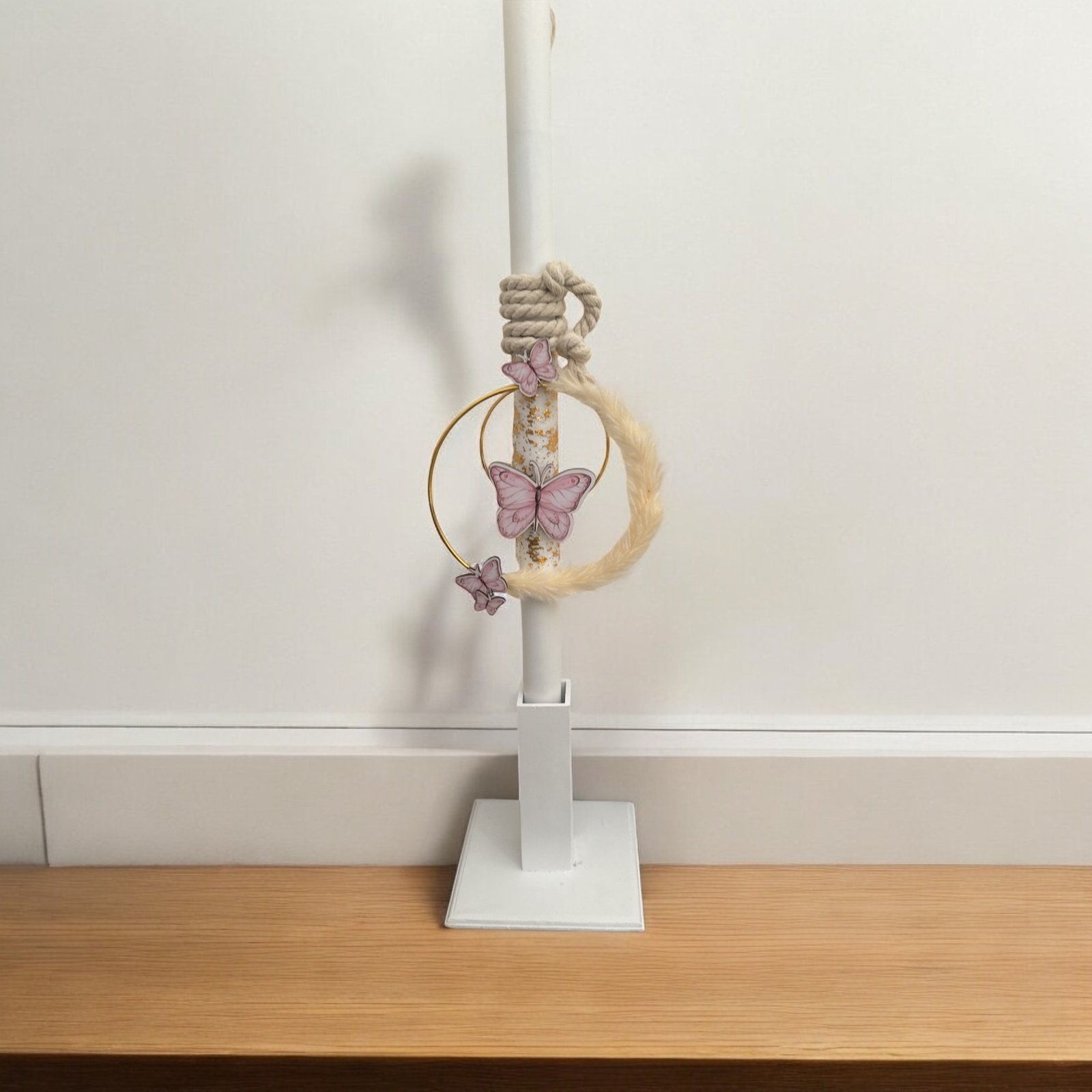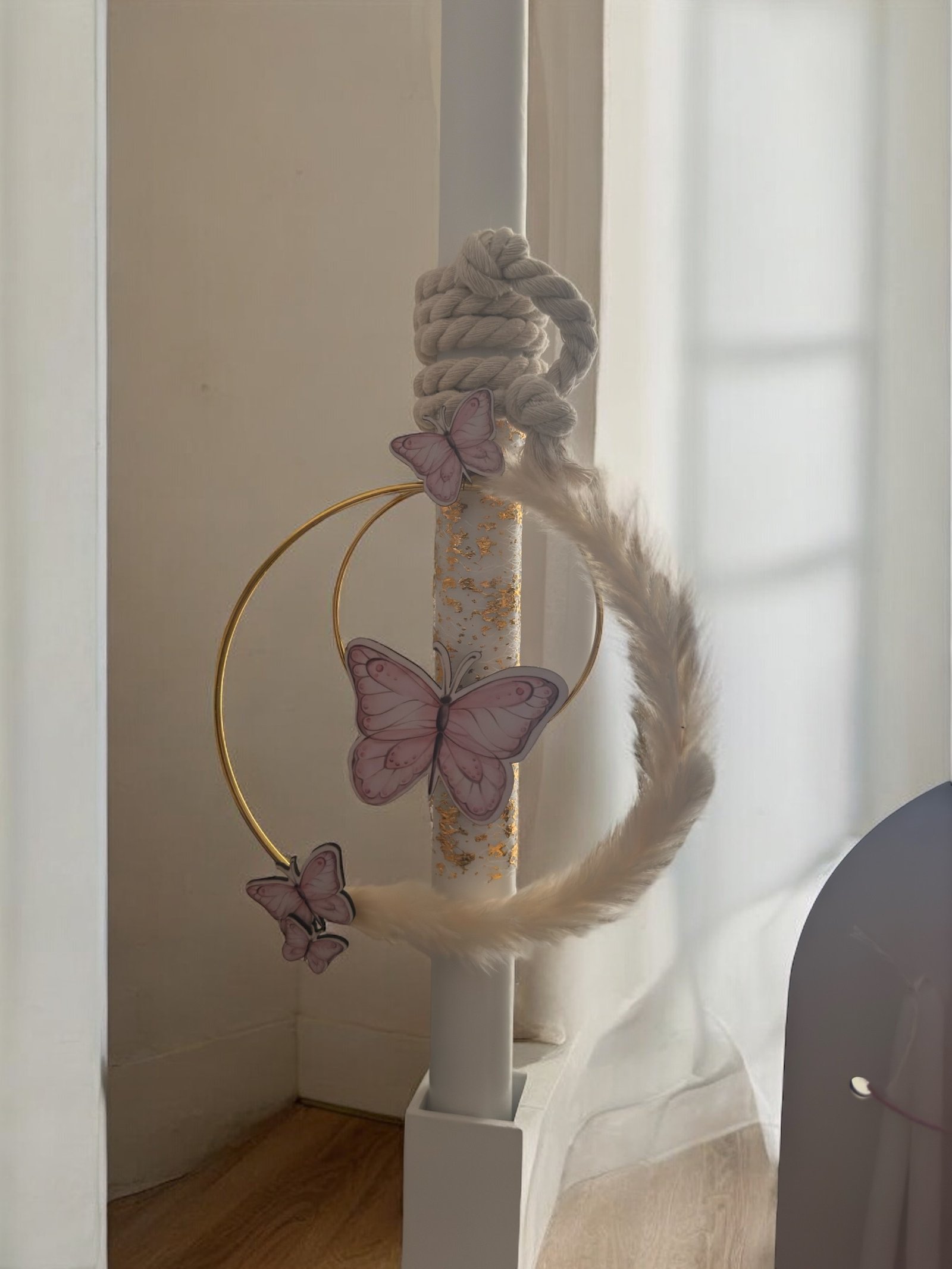 Ένα υπέροχο πακέτο βάπτισης, που αποτελείται από ξύλινο μπουντουάρ πεταλούδα, χειροποίητα βαμμένο σε χρώμα της επιλογής σας. Το πακέτο συνοδεύεται φυσικά από τη λαμπάδα , διακοσμημένη με πεταλούδες , pampas και δίχτυ με φύλλα χρυσού.