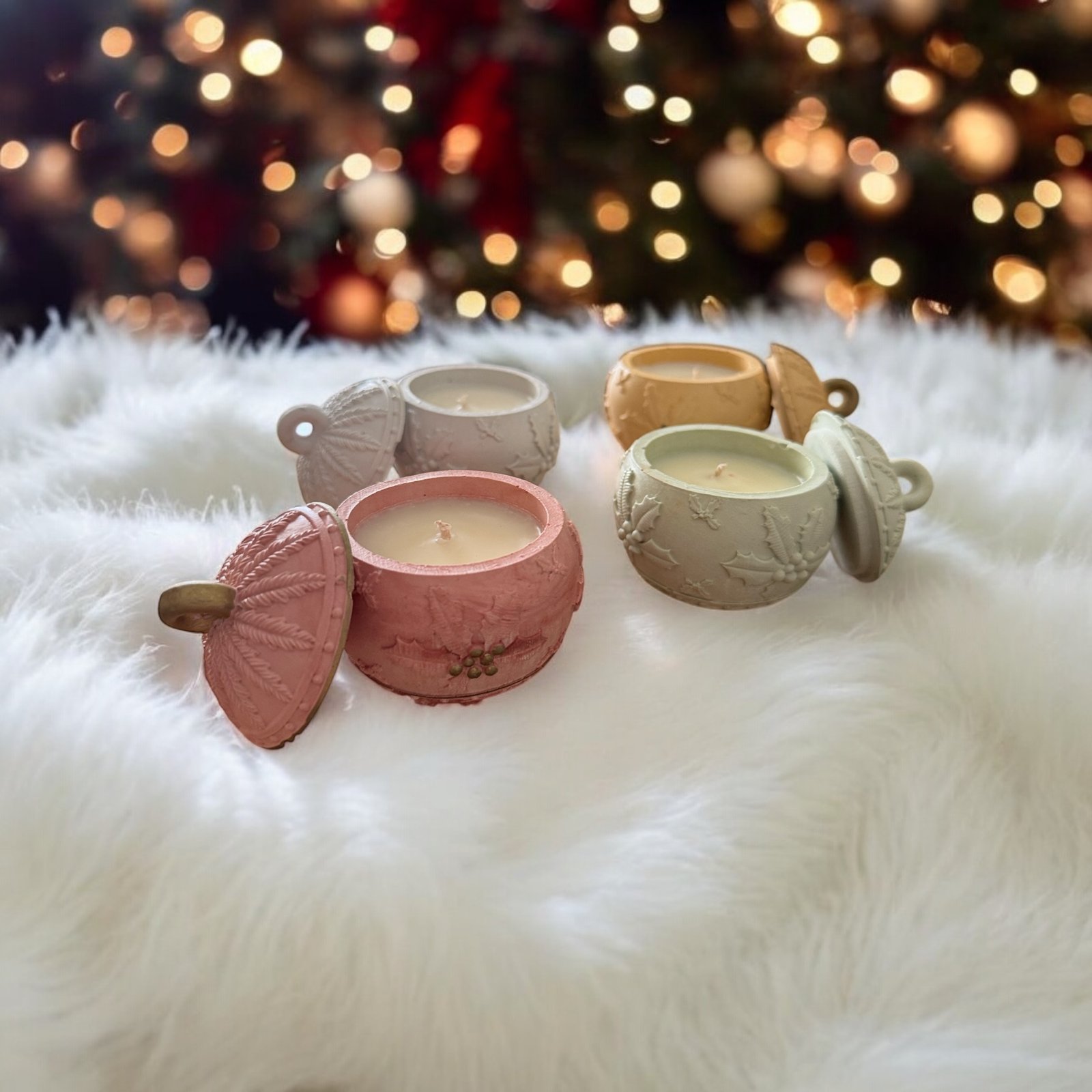 Δώστε στον χώρο σας ζεστασιά και γιορτινή ατμόσφαιρα με αυτό το χειροποίητο αρωματικό κερί σε βάζο από σκόνη πορσελάνης, σε σχήμα χριστουγεννιάτικης μπάλας. Ένα ιδιαίτερο διακοσμητικό που συνδυάζει κομψότητα, άρωμα και χριστουγεννιάτικο χαρακτήρα.