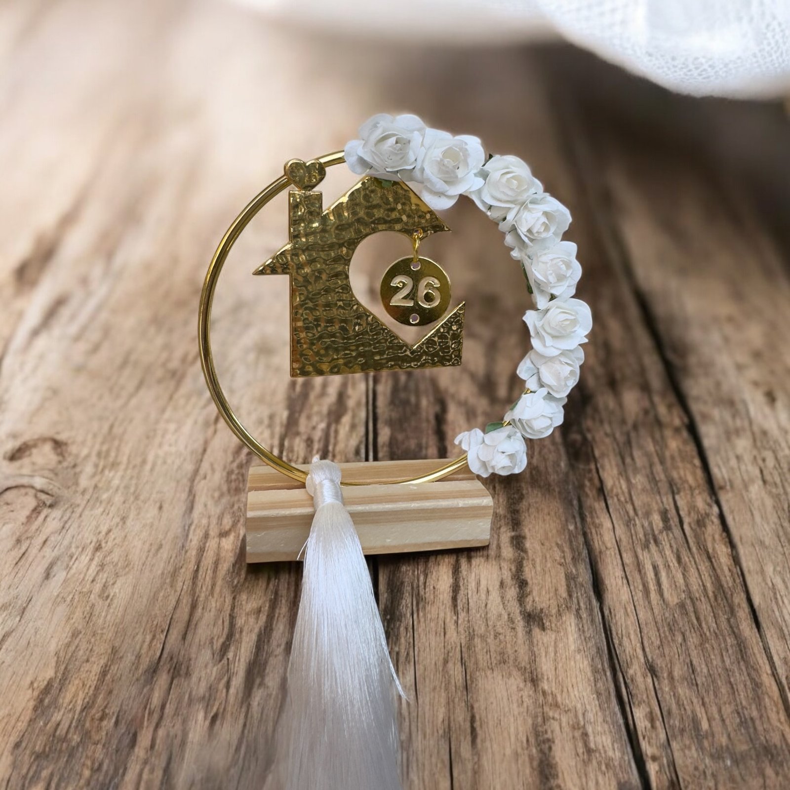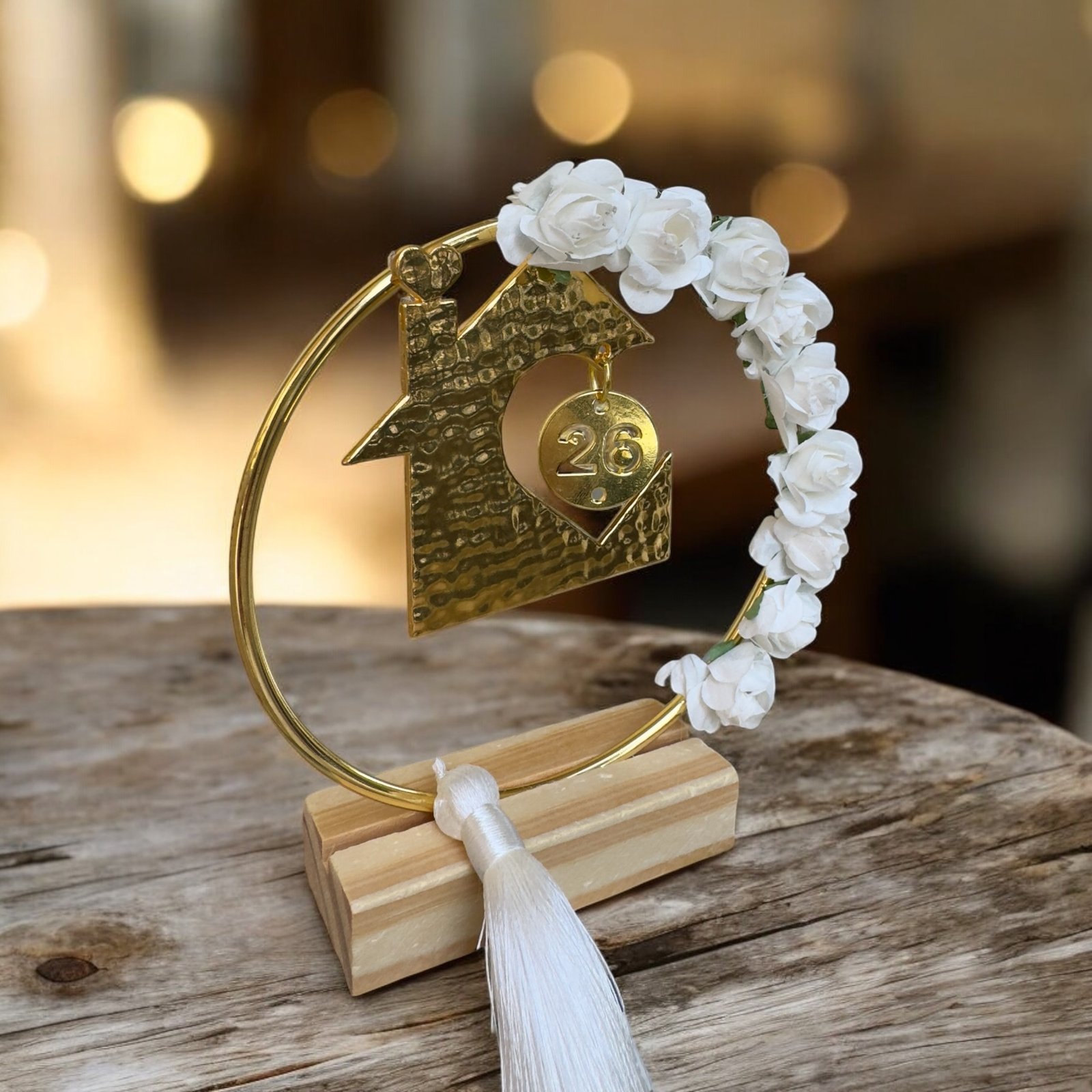Ένα κομψό, επιτραπέζιο χρυσό γούρι με κρεμασμένο στοιχείο σπιτιού, σύμβολο ασφάλειας, αγάπης και προστασίας. Ένα γούρι που εκφράζει ευχές για ένα σπίτι γεμάτο ζεστασιά, χαρά και θετική ενέργεια.