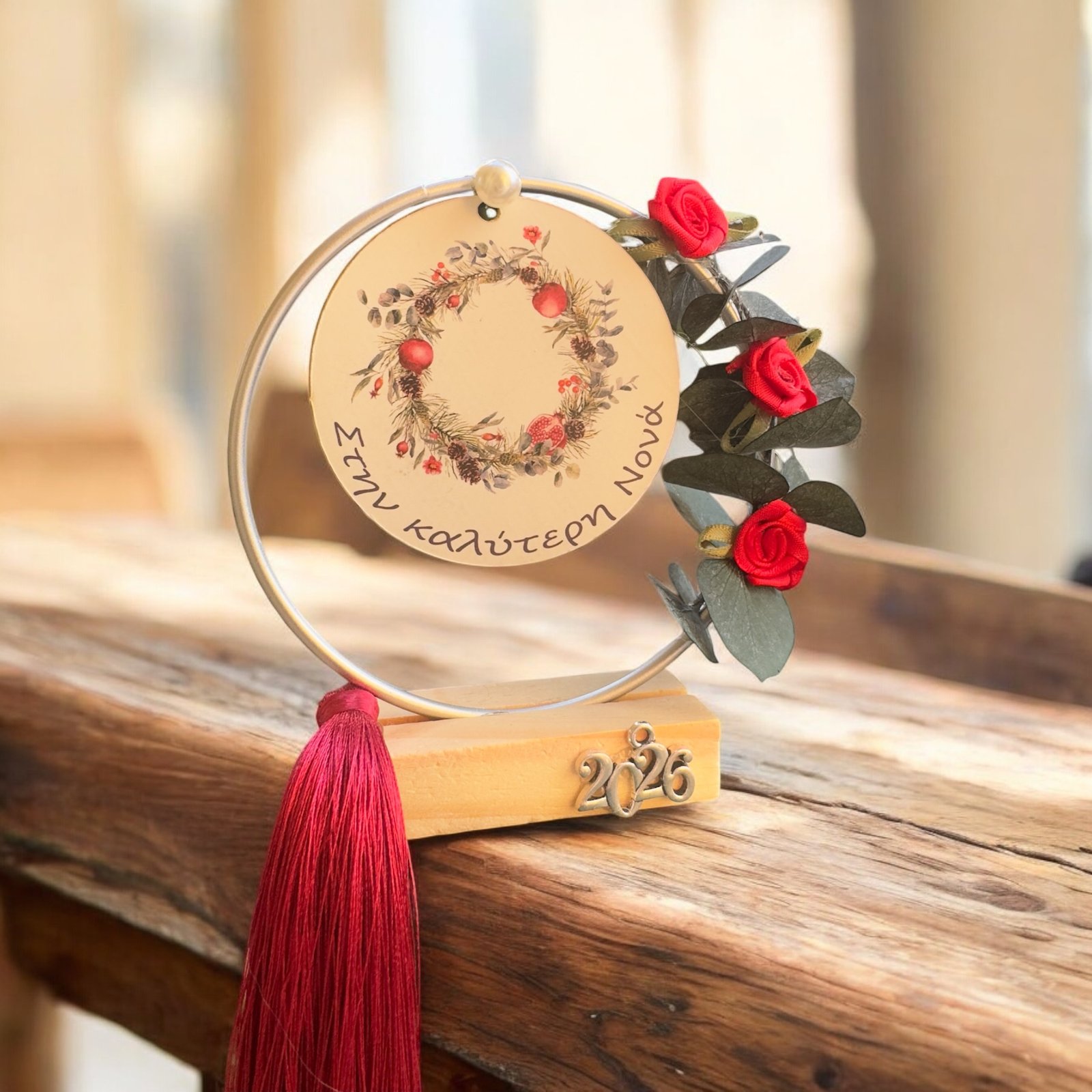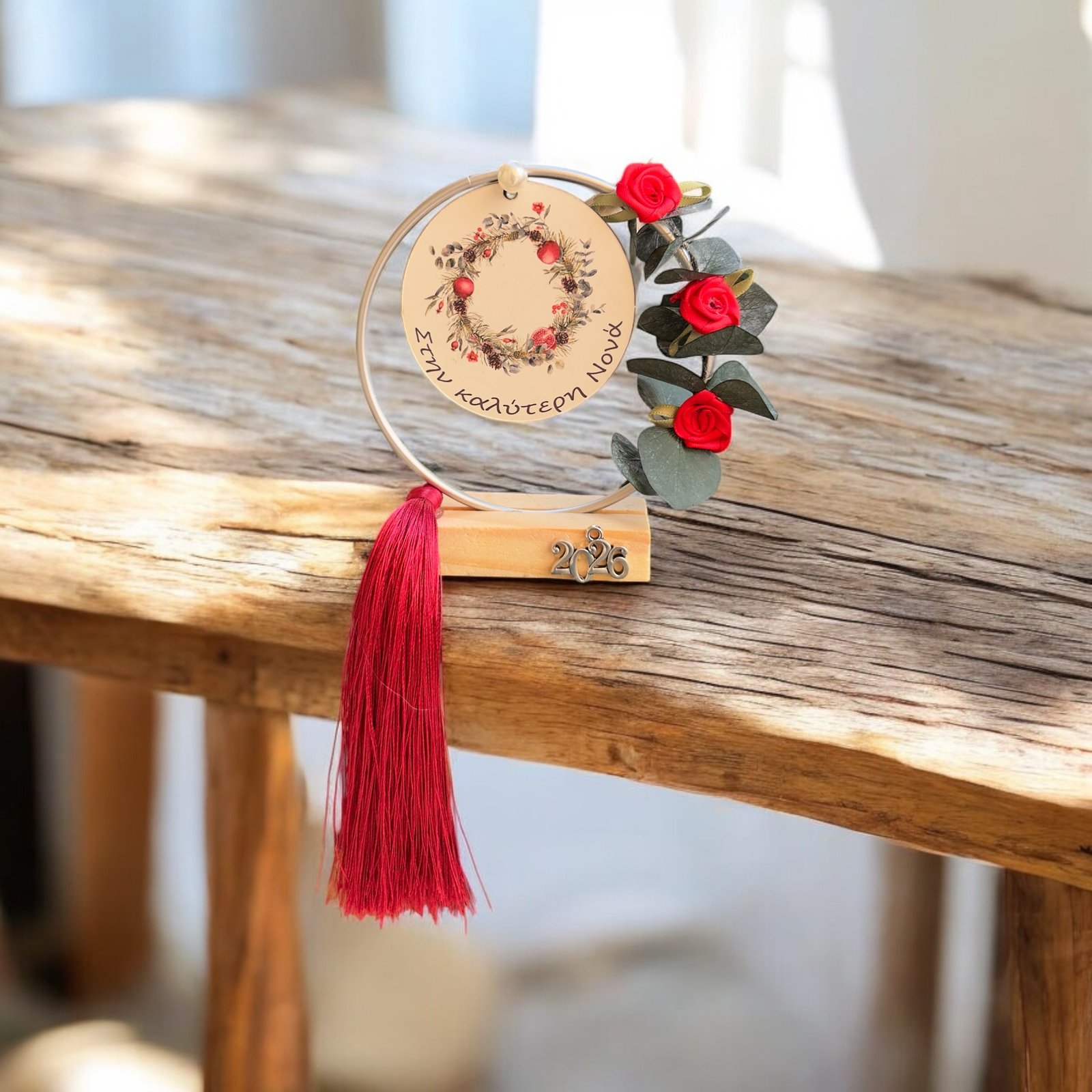 Ένα ξεχωριστό επιτραπέζιο γούρι σε μορφή ασημένιου μεταλλικού στεφανιού, διακοσμημένο με ευκάλυπτο, κόκκινα λουλούδια και κόκκινη φούντα. Στο κέντρο του κρέμεται ξύλινο διακοσμητικό με τη φράση «Στην καλύτερη νονά», σε κόκκινο-λευκό χρώμα.