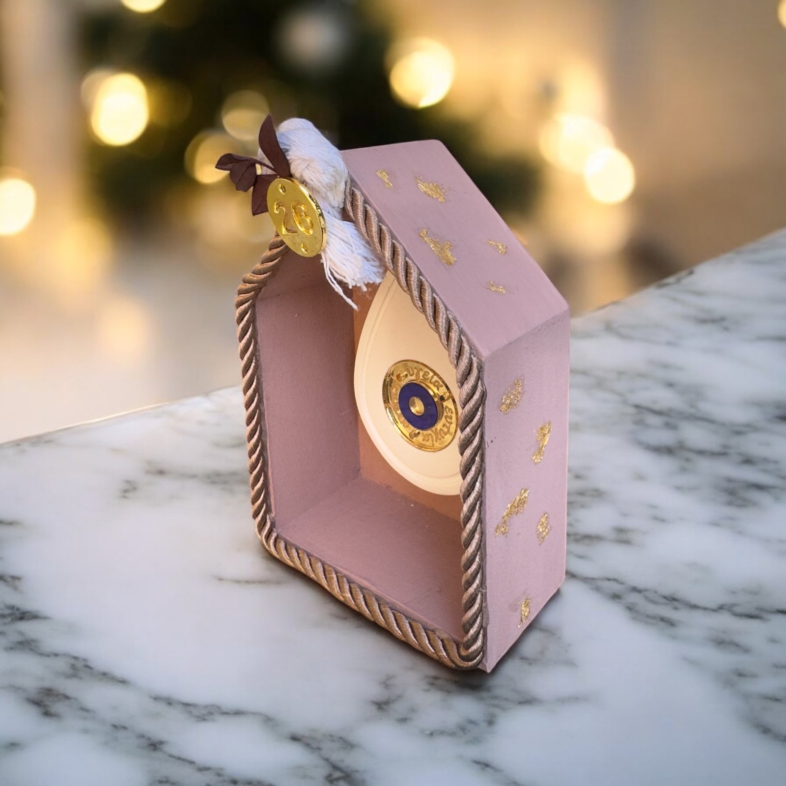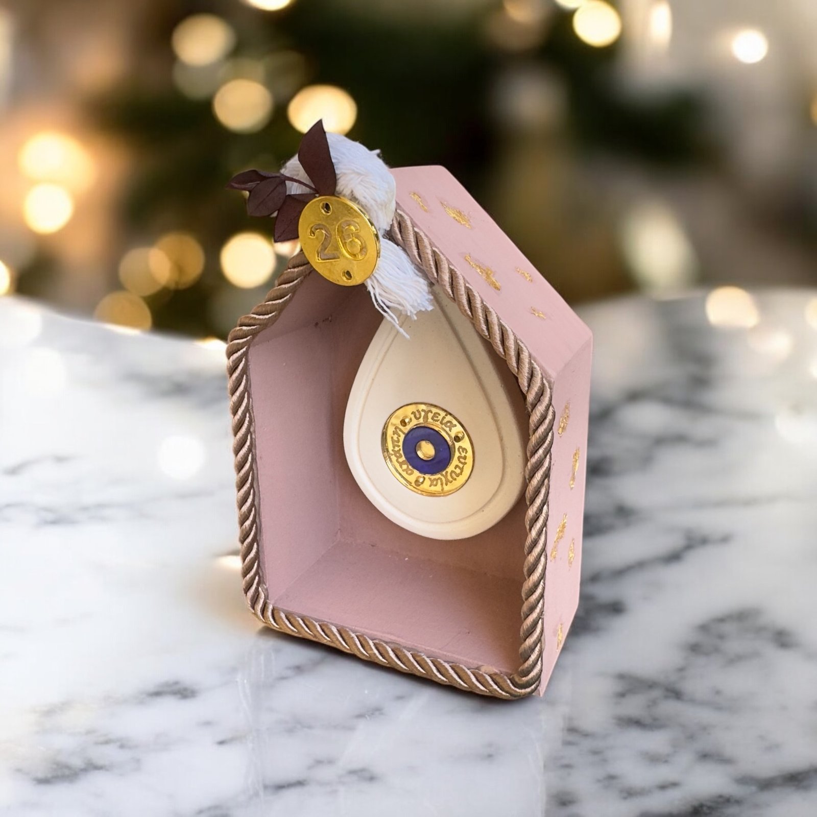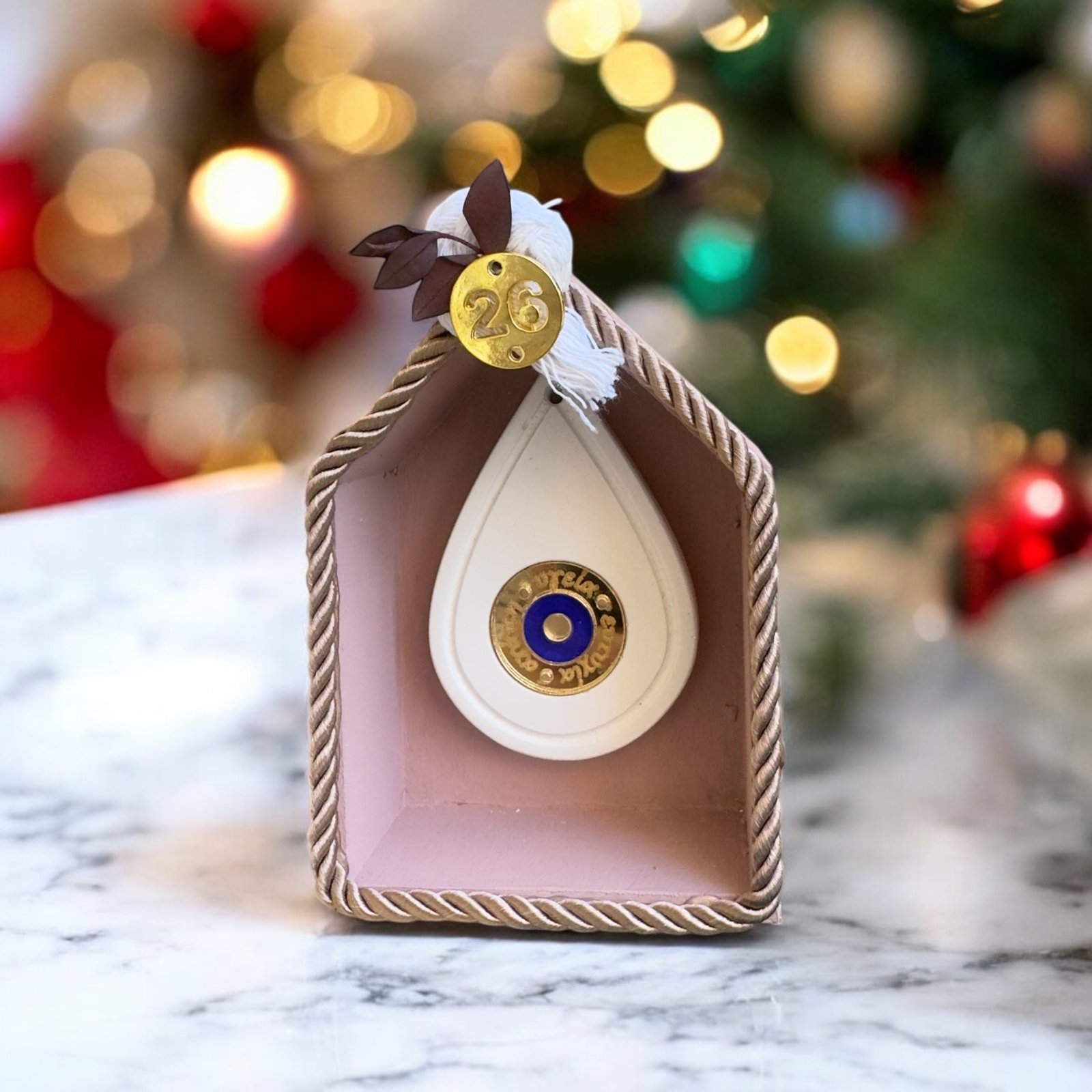 Ένα επιτραπέζιο γούρι σε σχήμα σπιτιού, σε απαλές αποχρώσεις πράσινου μήλου, με μάτι σε μορφή σταγόνας στο εσωτερικό του — σύμβολο προστασίας, θετικής ενέργειας και ισορροπίας.