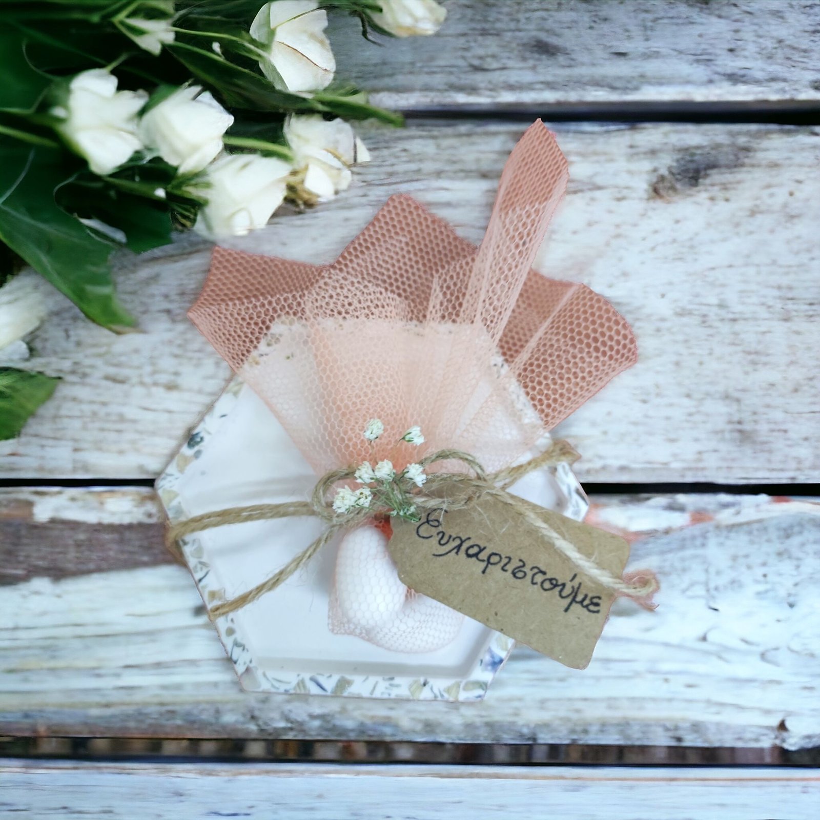 - Τούλι, κορδoνάκι και αποξηραμένο λουλούδι