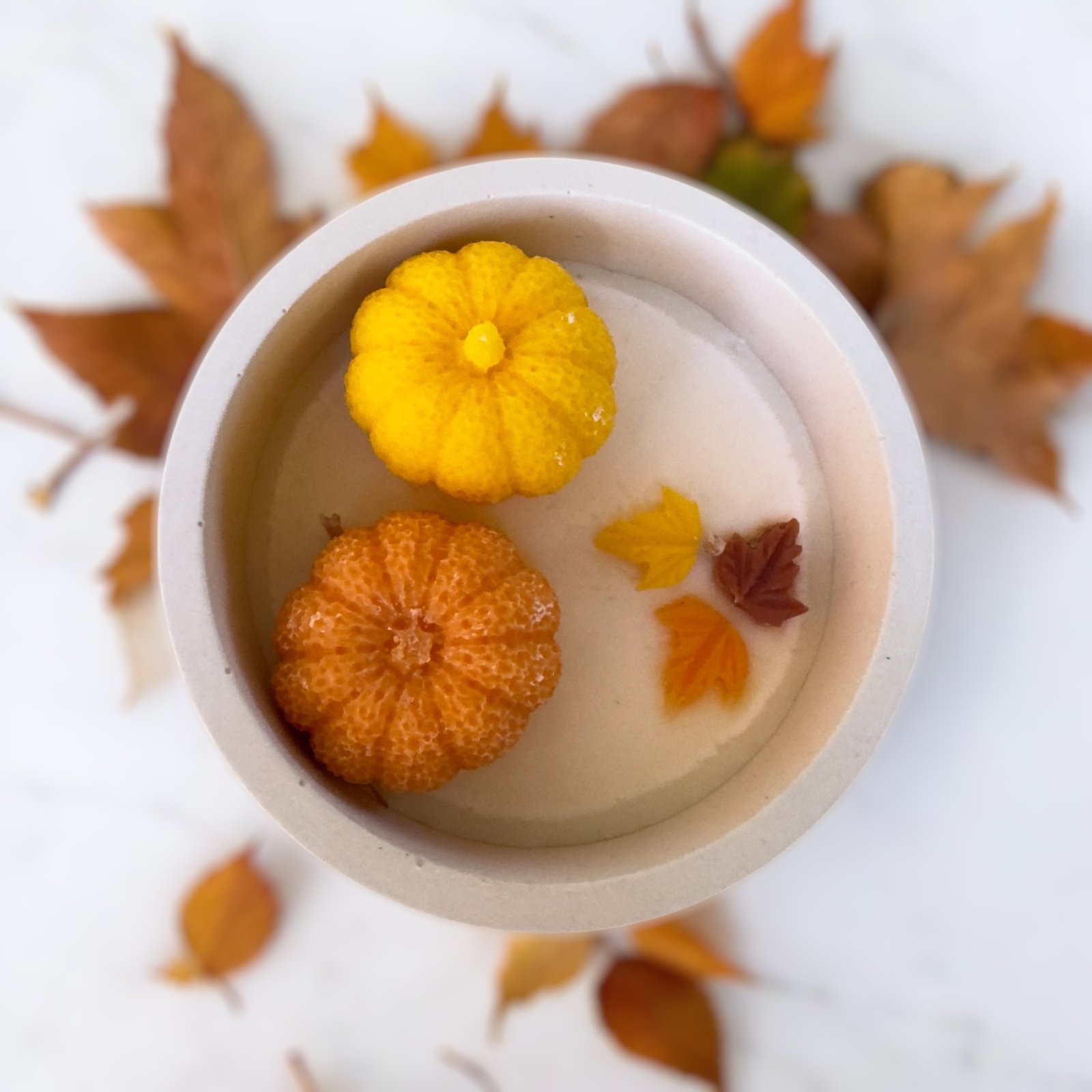 • Διακόσμηση: Κέρινες κολοκύθες & φύλλα