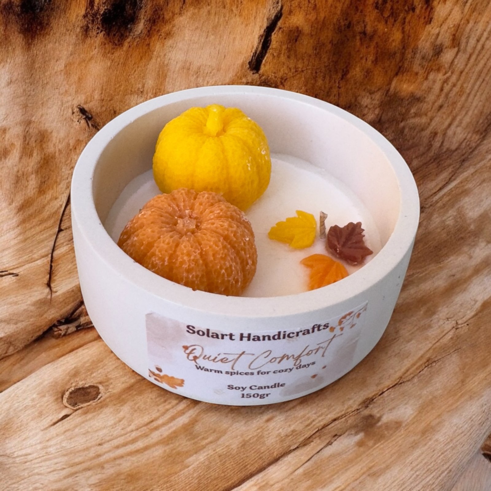 Ένα χειροποίητο αρωματικό κερί από 100% φυτική σόγια, εμπνευσμένο από τη ζεστή και γλυκιά αίσθηση του αγαπημένου carrot cake. Το κερί φιλοξενείται σε στρογγυλό βάζο από σκόνη πορσελάνης και διακοσμείται στο εσωτερικό του με κέρινες κολοκύθες και φύλλα, δημιουργώντας ένα μοναδικό, φθινοπωρινό και cozy αποτέλεσμα.