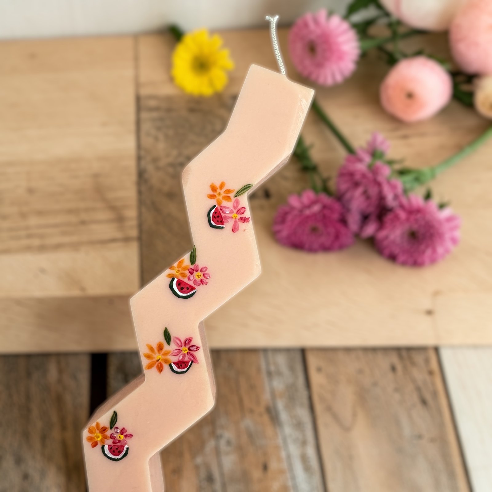 Σομόν λαμπάδα με καρπούζια και λουλούδια, αρωματισμένη με ζουμερό mango. Φρέσκια, φρουτώδης και αισιόδοξη, αποπνέει ανοιξιάτικη και καλοκαιρινή ενέργεια. Από φυτικό κερί 120-130γρ και ιδανική για επαναχρησιμοποίηση ως wax melts.